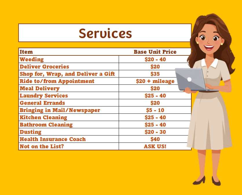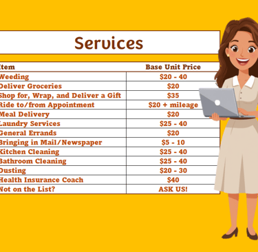 Affordable services including errands, cleaning, personal services, and support tailored to your needs.